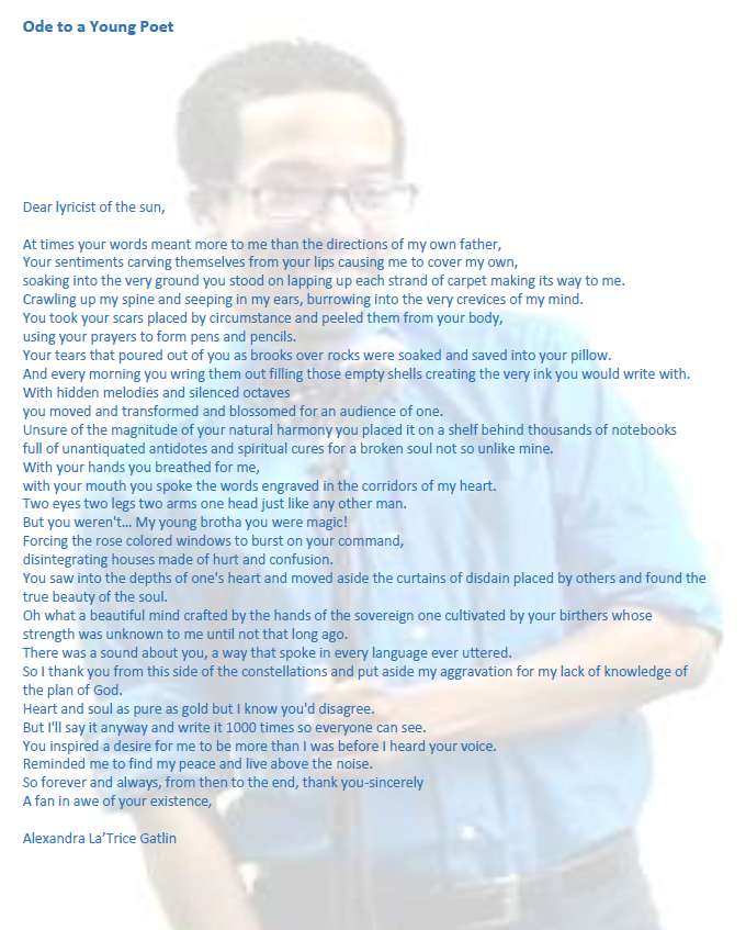 As I walked into that room, 312A, they said… my heart stopped again as I saw wire by wire, plug on top of plugs, needles side by side, and machines, machines everywhere. And I picked it up again as I reached out to lay my hands on him. If only I could… I reached out to hug him (be careful, somebody said, “watch out for the wires.”). I held his hand, I kissed his forehead and I gathered up the strength to speak to him, words of life, (the Word is your life, I heard). “Joseph, it’s your mother. I know you can hear me. I’m back from Chicago. You can wake up now… You don’t have to be afraid, it’s gonna be okay. You’re gonna be okay. We’re all here with you.” And I felt my heart flutter as I saw his eyelids jump---- “He hears me,” I said aloud. “Lord, just open his eyes.” I stood there for a while, unaware of anyone else, continuing to speak life to him, speak life over him, recalling the things he had done--- then the words he had spoken to me, last, “I love you mom.” And I felt my heart race as I remembered, my last words to him, “I love you too, Joe.”