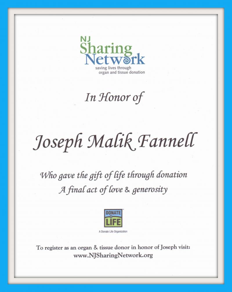 7/17/15 Okay so we just got that official letter telling us that since Joe was a (vital) organ donor, he saved the lives of four people. Two men age 66, one man age 37, and a 23 year old young lady. Some good has come out of this... smile emoticonOur Joe Fannell shall continue to live on in more ways than one. #ripJoe